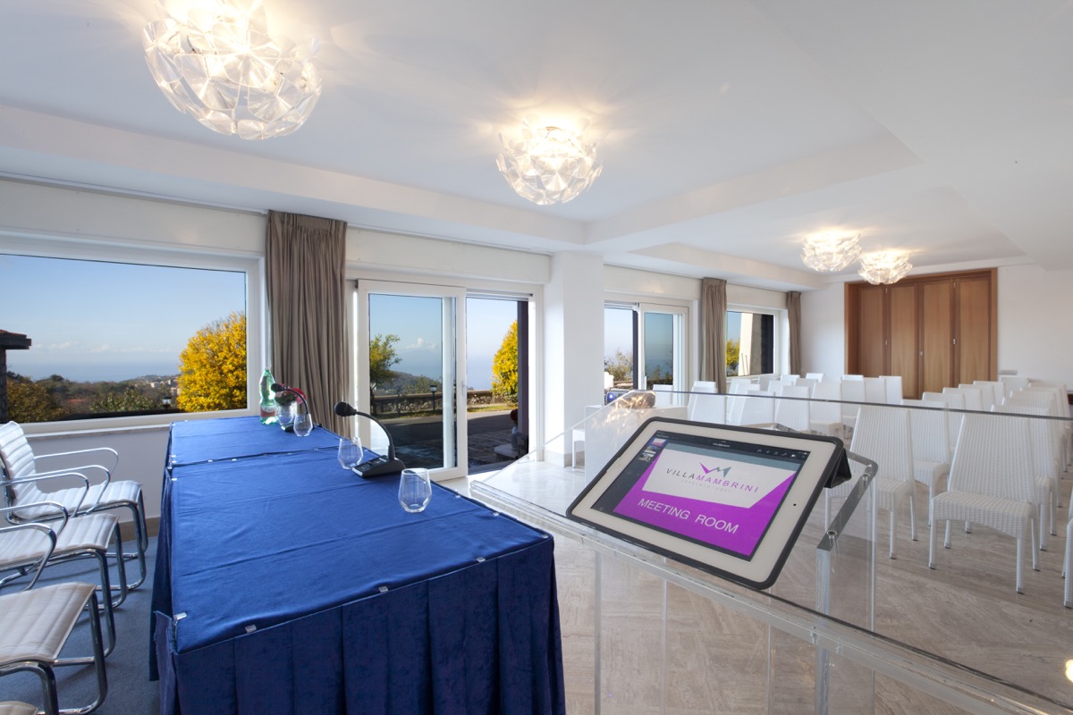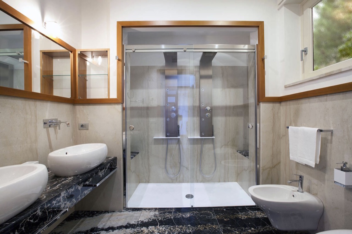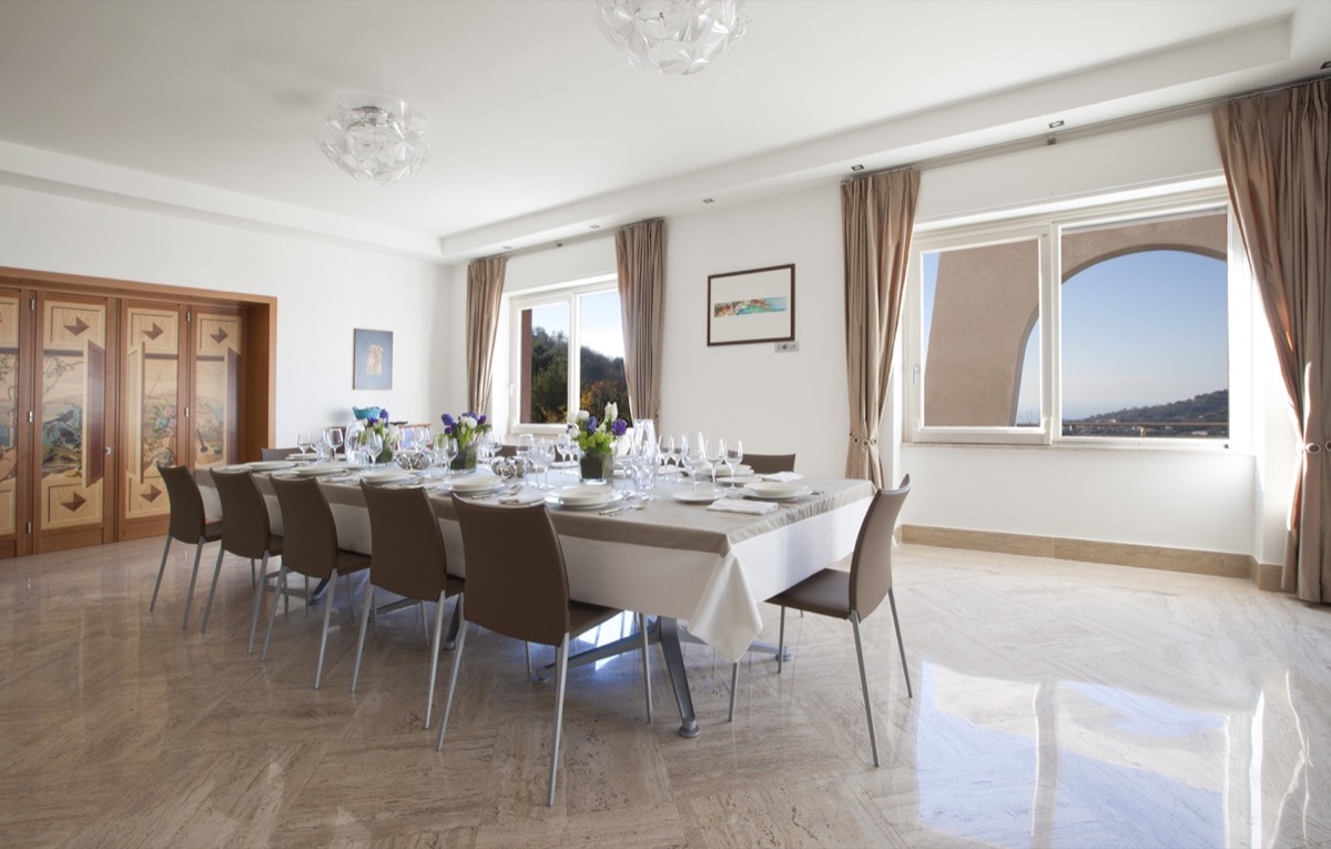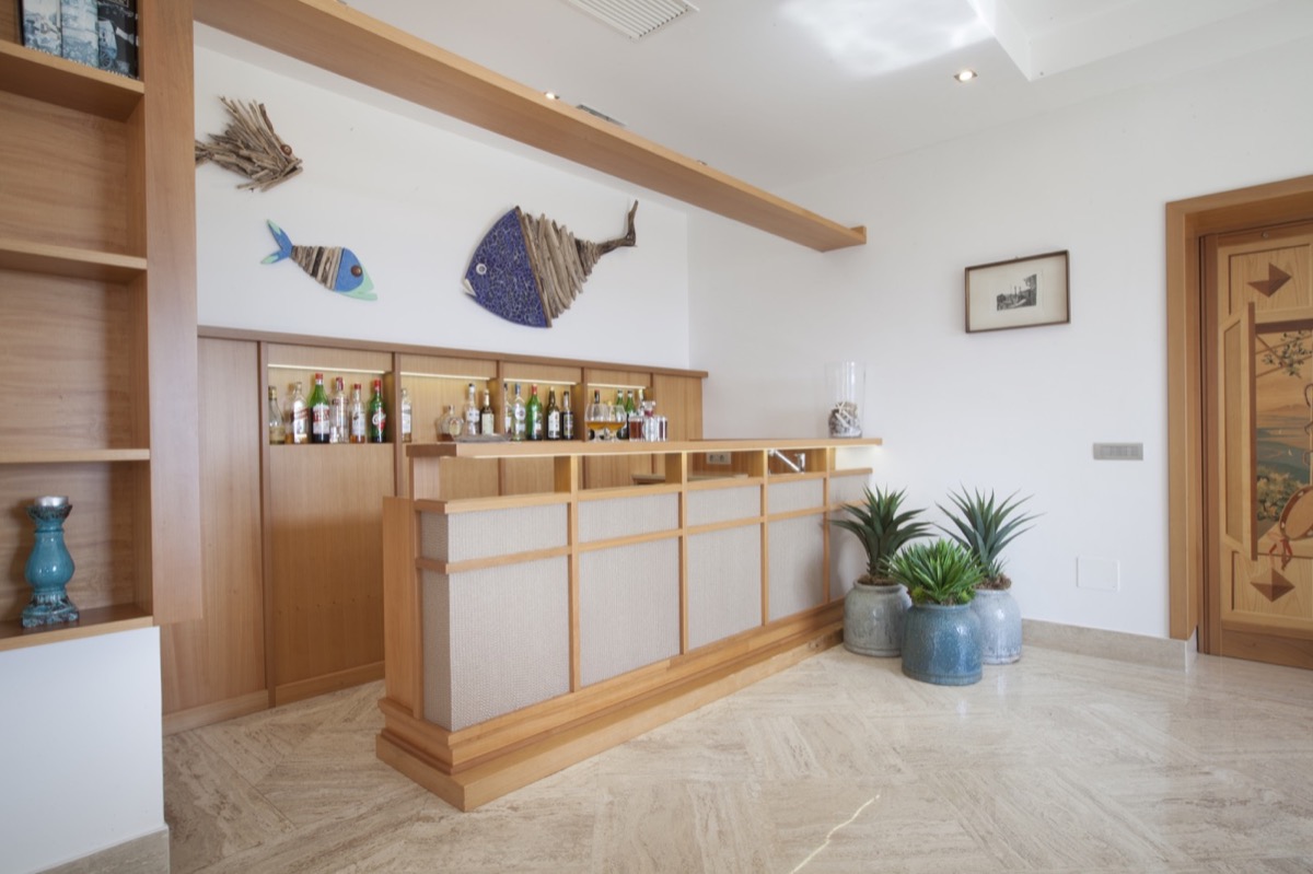 On the first floor there are 5 of the 6 bedrooms and a beautiful terrace, which, besides offering a breathtaking view, has a minipool with hydromassage for those who love to relax. The terrace connects also the villa to a fully equipped gym with sauna.
