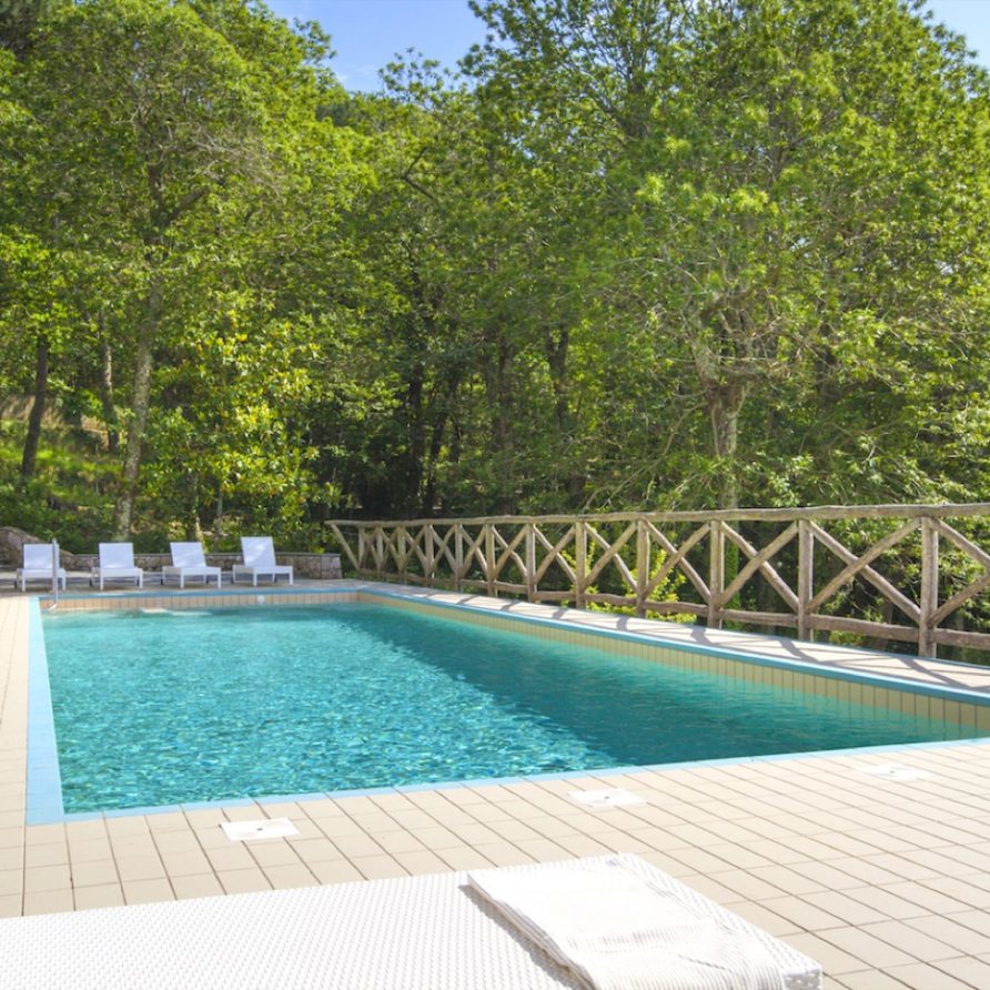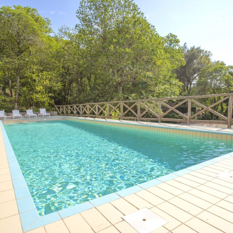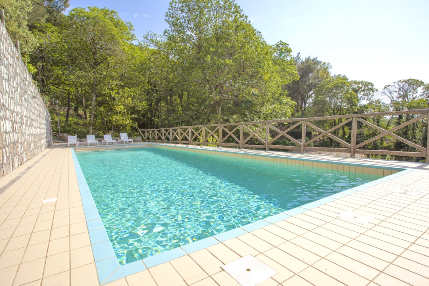 On the lower terrace there is a swimming pool with indoor whirlpool, a large solarium with sun beds, umbrellas, tables and chairs, an outdoor shower and a dressing room with a small bathroom.