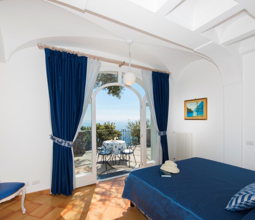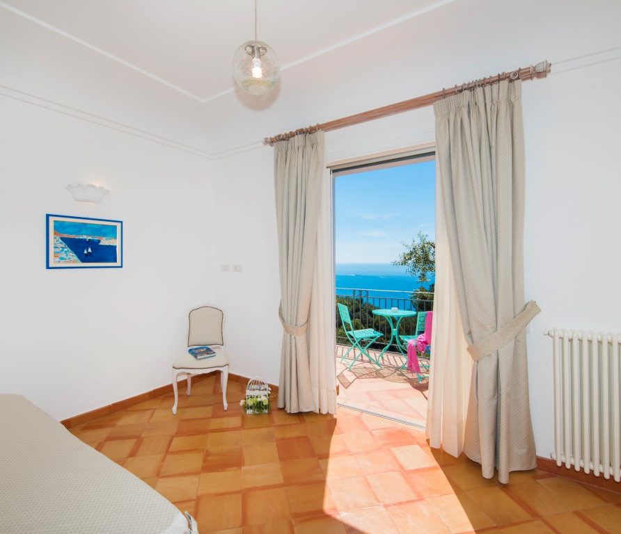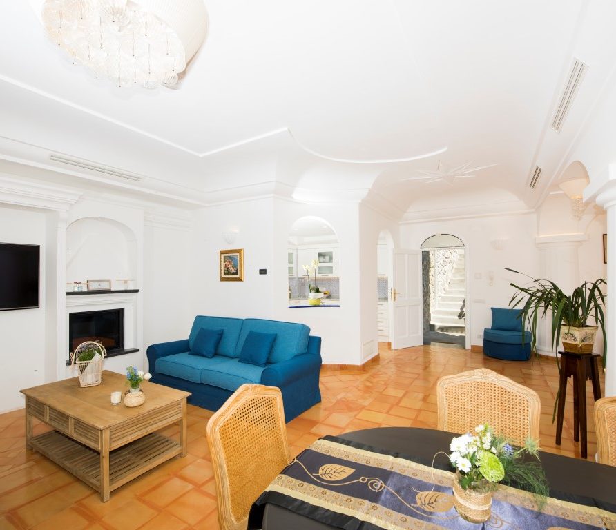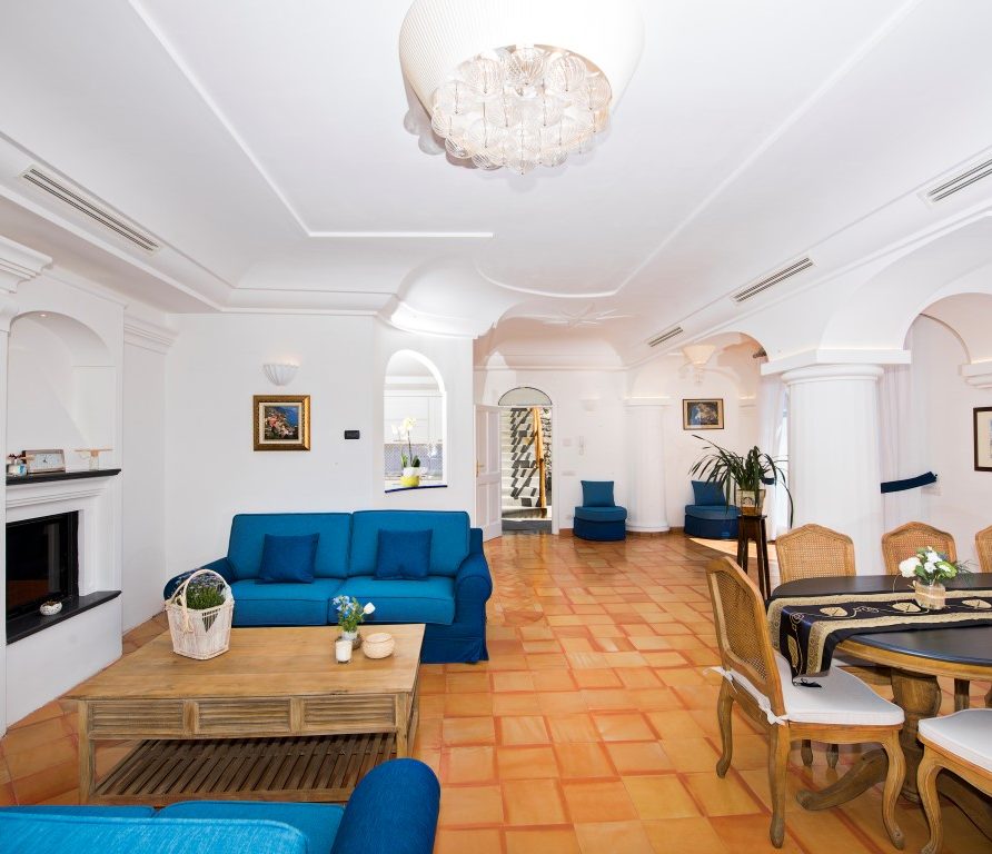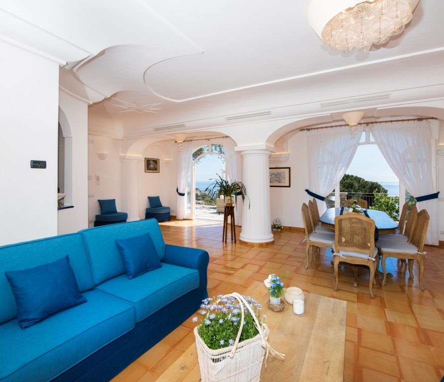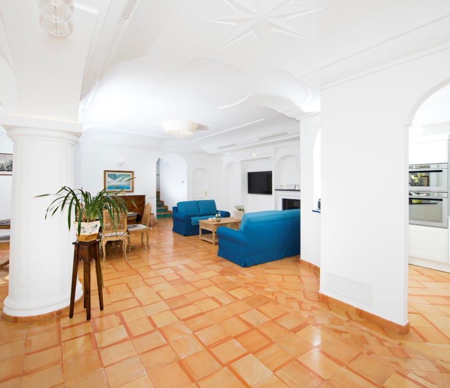 The living room of Villa Ulisse leads to one of the four bedrooms. All four bedrooms have private balconies and terrace access.