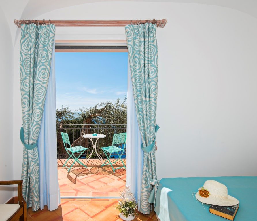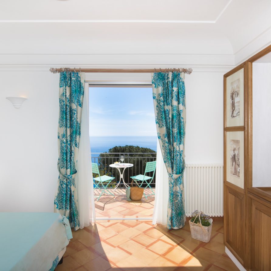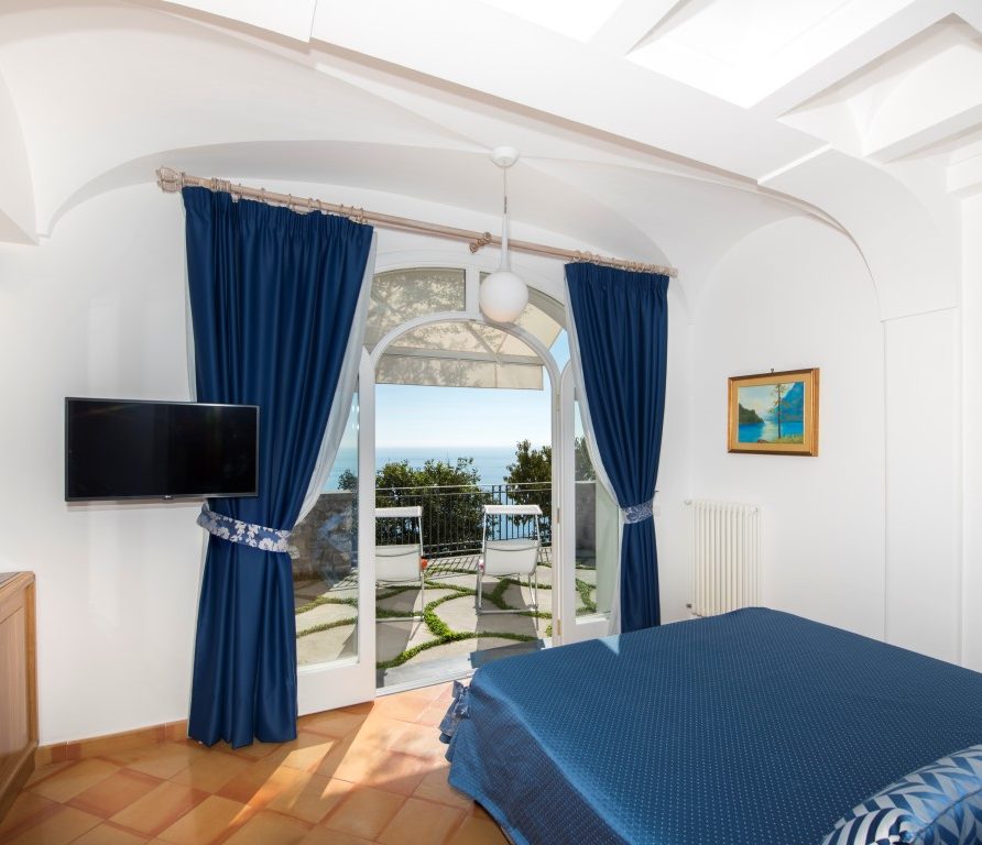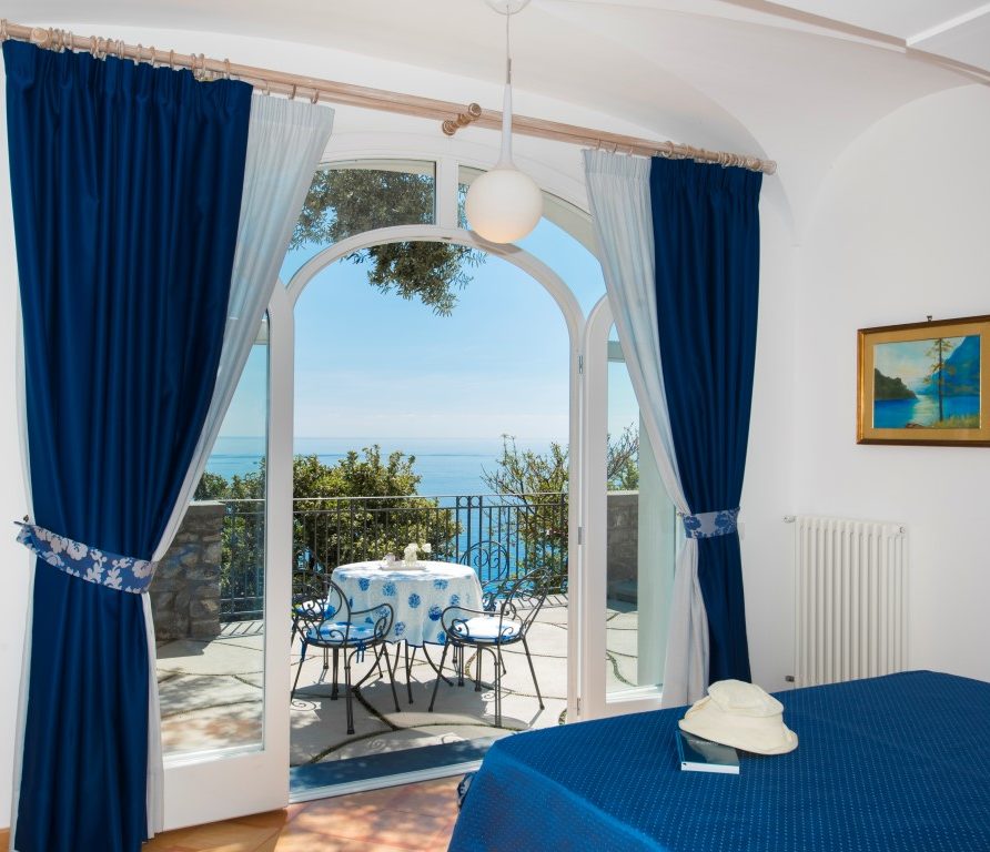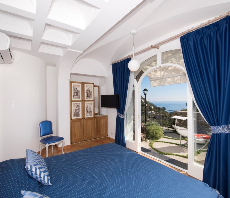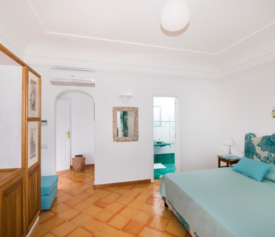The living room of Villa Ulisse leads to one of the four bedrooms. All four bedrooms have private balconies and terrace access.