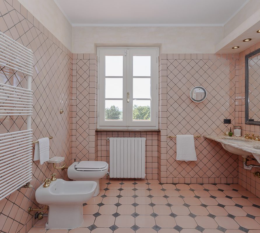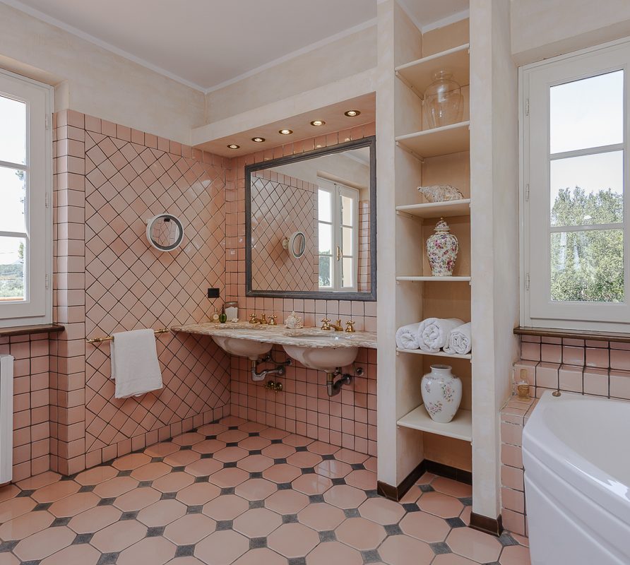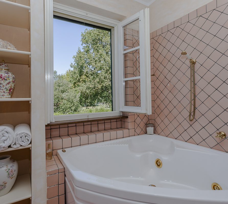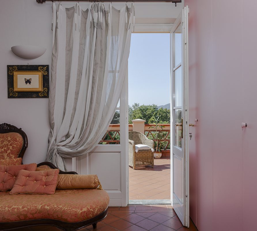 Pink Room: double bed and terrace view. Private bathroom with bathtub whirlpool and shower.