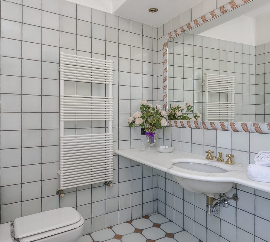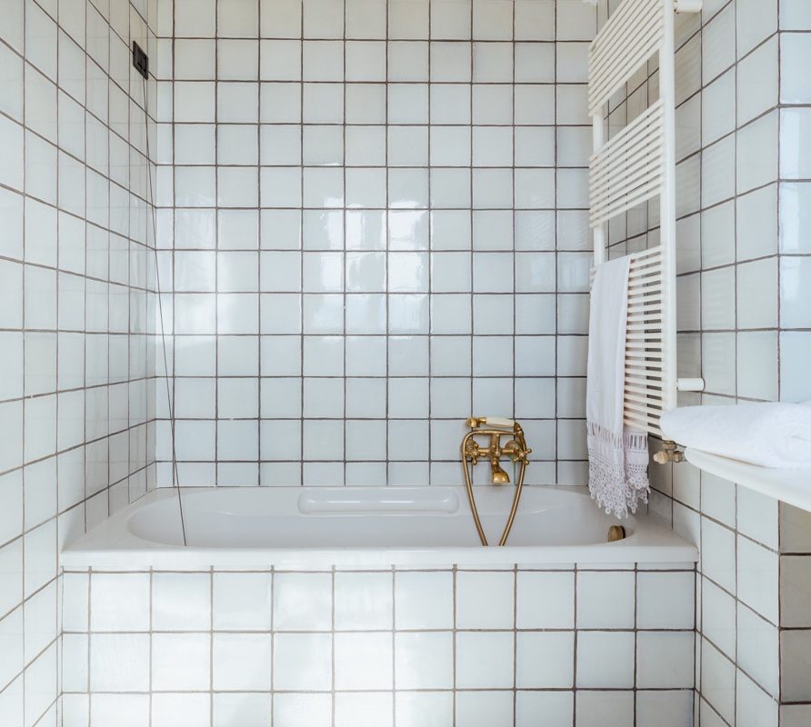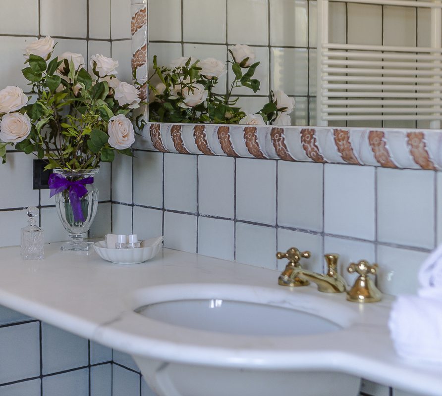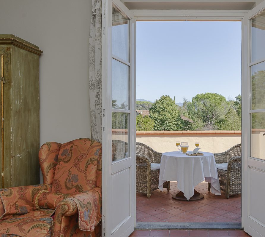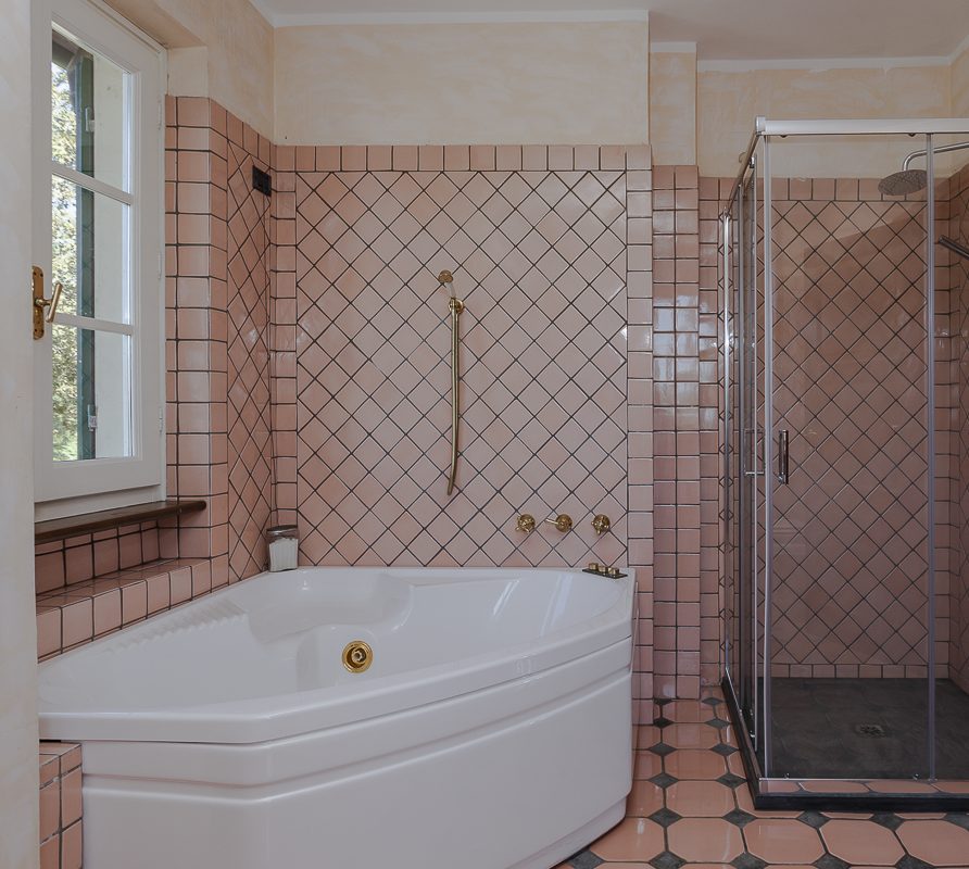 Pink Room: double bed and terrace view. Private bathroom with bathtub whirlpool and shower.