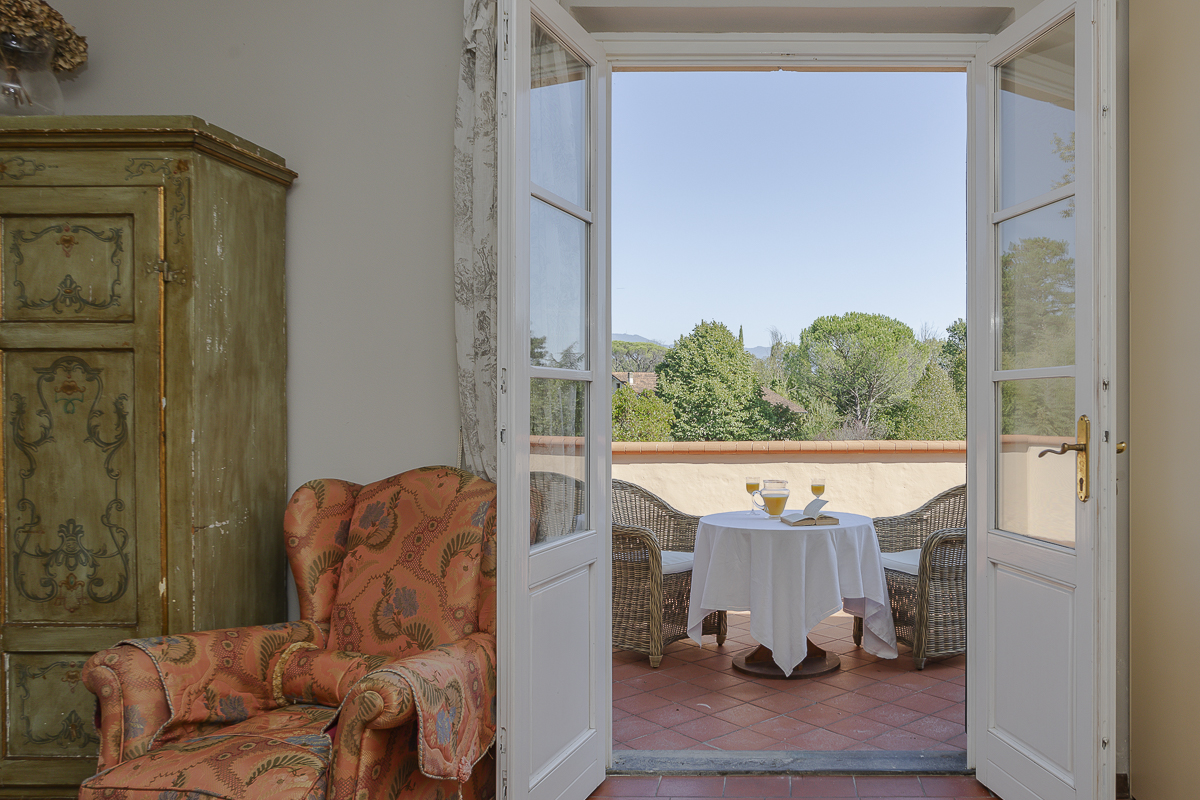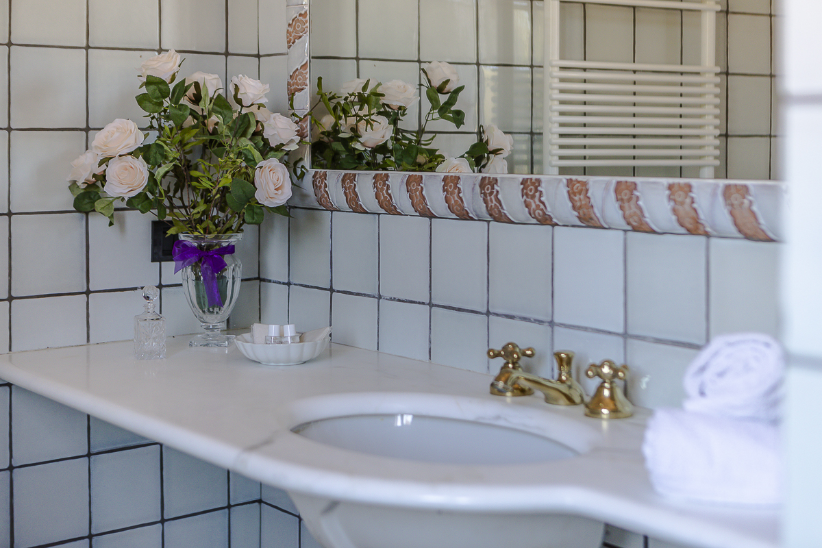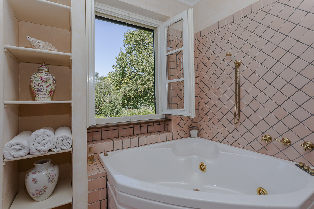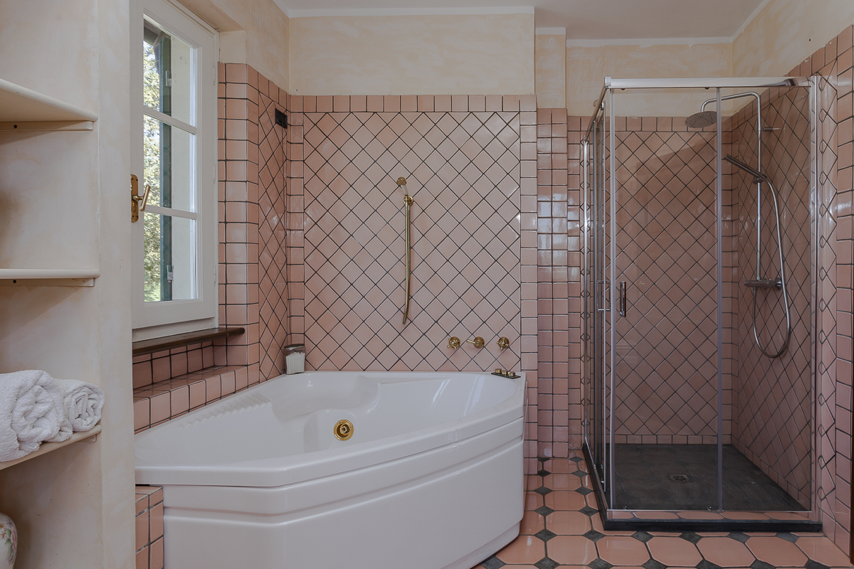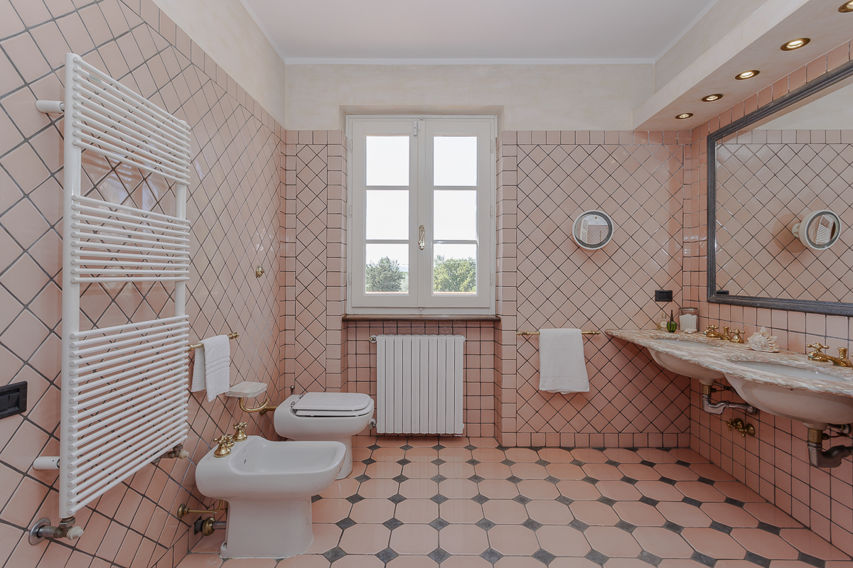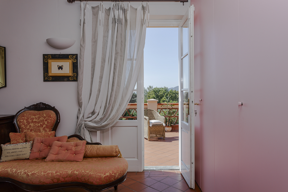 Pink Room: double bed and terrace view. Private bathroom with bathtub whirlpool and shower.