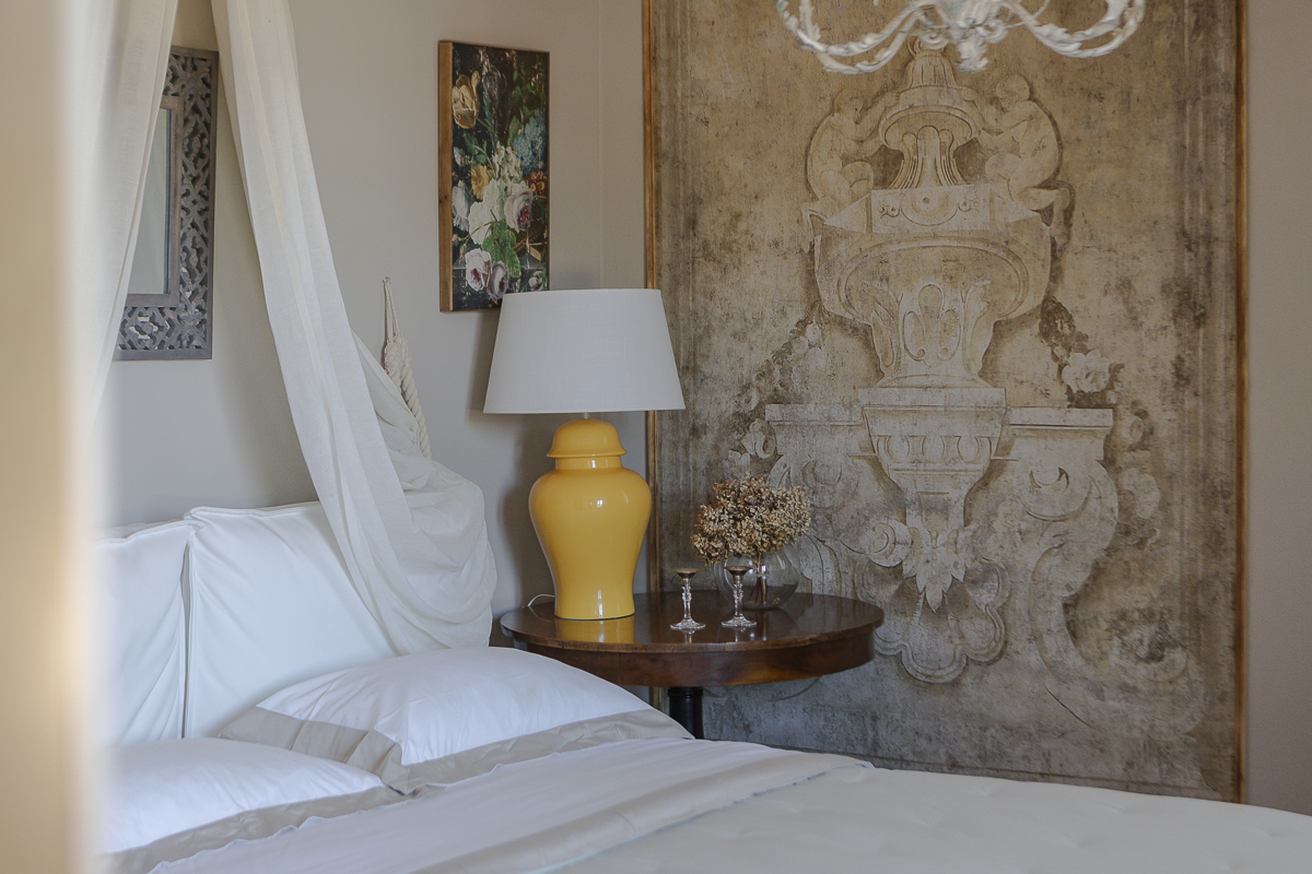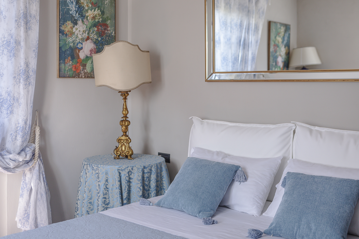 Yellow Room: Double bed overlooking the terrace. Private bathroom with shower.